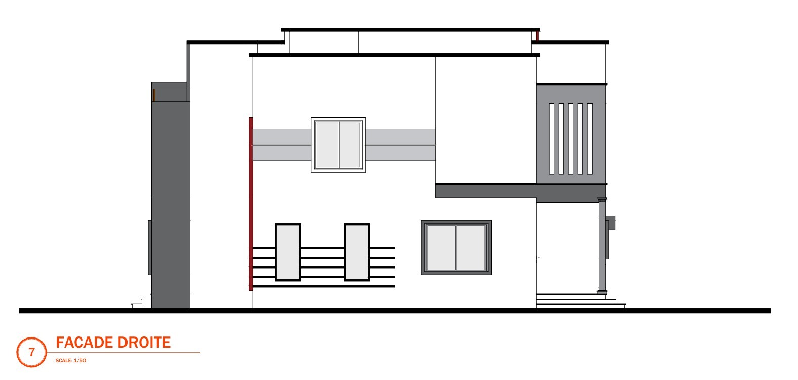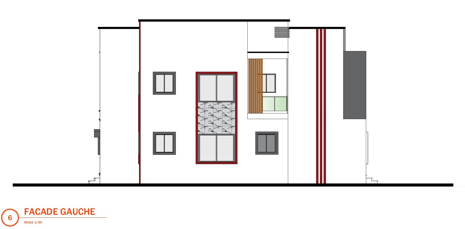 · Plans des façades : Chaque façade du projet (avant, arrière, côtés) est représentée. Ces plans détaillent l'aspect extérieur : ouvertures (portes et fenêtres), matériaux de parement, balcons, toiture, etc.