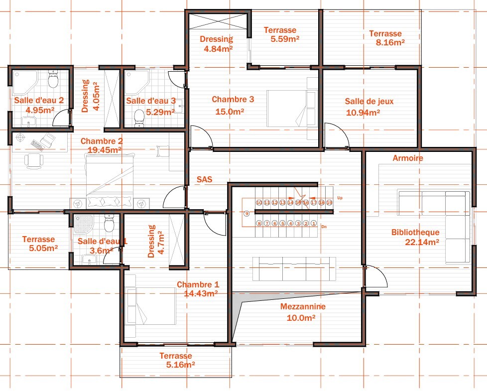 · Plans des niveaux (ou plans de l'intérieur) : Ils représentent l'aménagement de chaque étage. On y voit la disposition des pièces, l'emplacement des murs, des portes, des fenêtres, et les cotes (dimensions) des espaces.