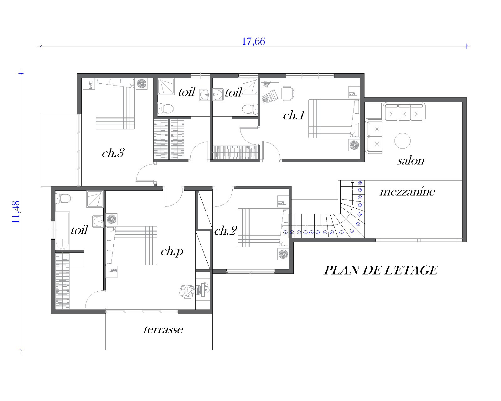 · Plans des niveaux (ou plans de l'intérieur) : Ils représentent l'aménagement de chaque étage. On y voit la disposition des pièces, l'emplacement des murs, des portes, des fenêtres, et les cotes (dimensions) des espaces.