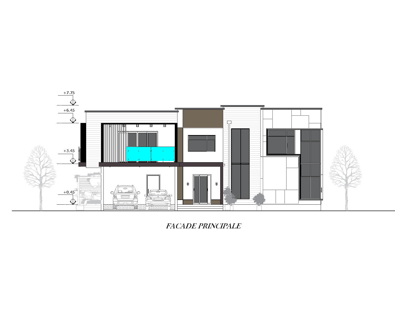 · Plans des façades : Chaque façade du projet (avant, arrière, côtés) est représentée. Ces plans détaillent l'aspect extérieur : ouvertures (portes et fenêtres), matériaux de parement, balcons, toiture, etc.